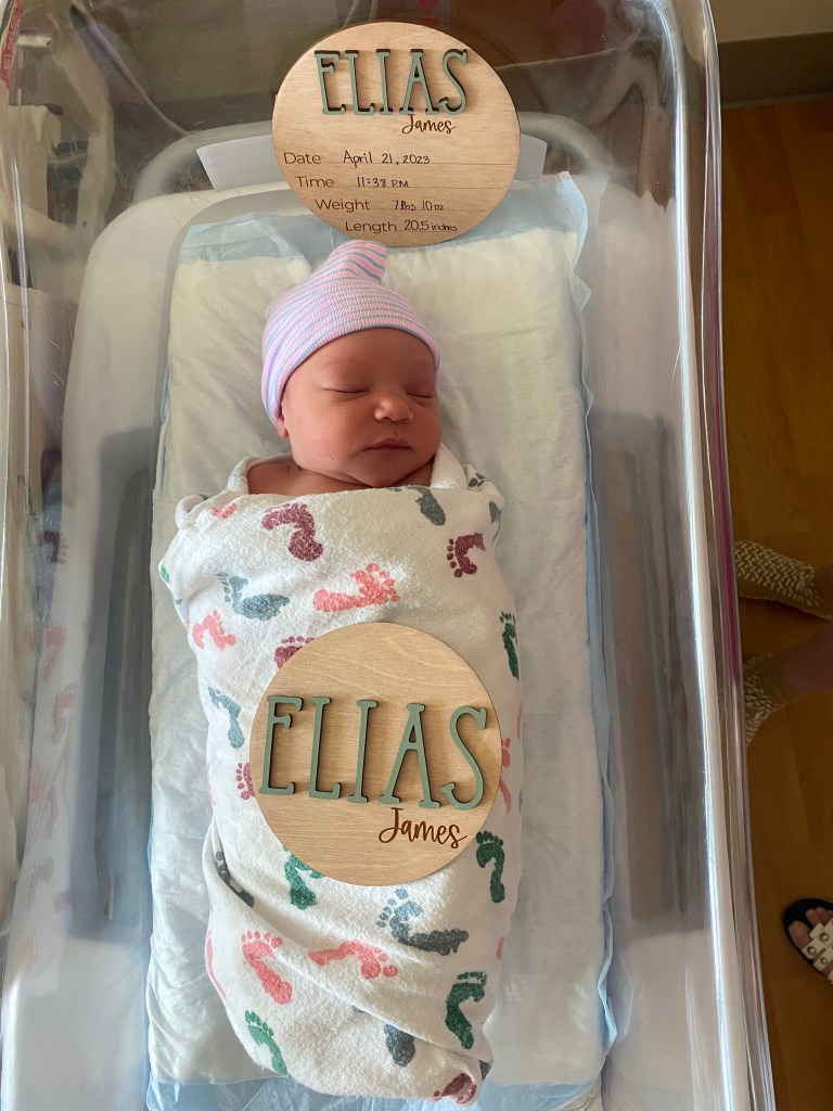 Hi! We arrived home from the hospital after lunch on 4/23/23 with our sweet baby boy! Before the details blur here is his birth story … it was everything & more. We are so thankful for God’s provision. Kristoff and I feel more connected and that our relationship still remains #1, which is something we discussed often before E’s arrival. It has been such a joy to be a team in these early days. The neatest thing? We are still us!! I used to think I would feel different in another country and then I traveled … and I felt like myself. I was thrilled. I used to think I would feel different as a mom, but then I had a baby & I am still myself. I’m more emotional and feel the extremes faster, yes, but I am still myself. I am thrilled to join the motherhood club, as I unleash expectations and live in the moment. So far, it’s been my very favorite thing to parent with Kristoff. He has taken Elias on no less than 10 house tours and described to him in detail everything we’ve done to make this house a home. He talks to him constantly and I just adore him for it. Currently our reality is that we spend every waking moment admiring him and loving on him. I think we spend no less than 7 hours a day staring at him if my calculations are correct as we whisper, “He is ours?! God is so good. Just wow. He is perfect.” Our life has been enriched tenfold and we are so grateful!! Check out Elias’s stats in the photo below.
