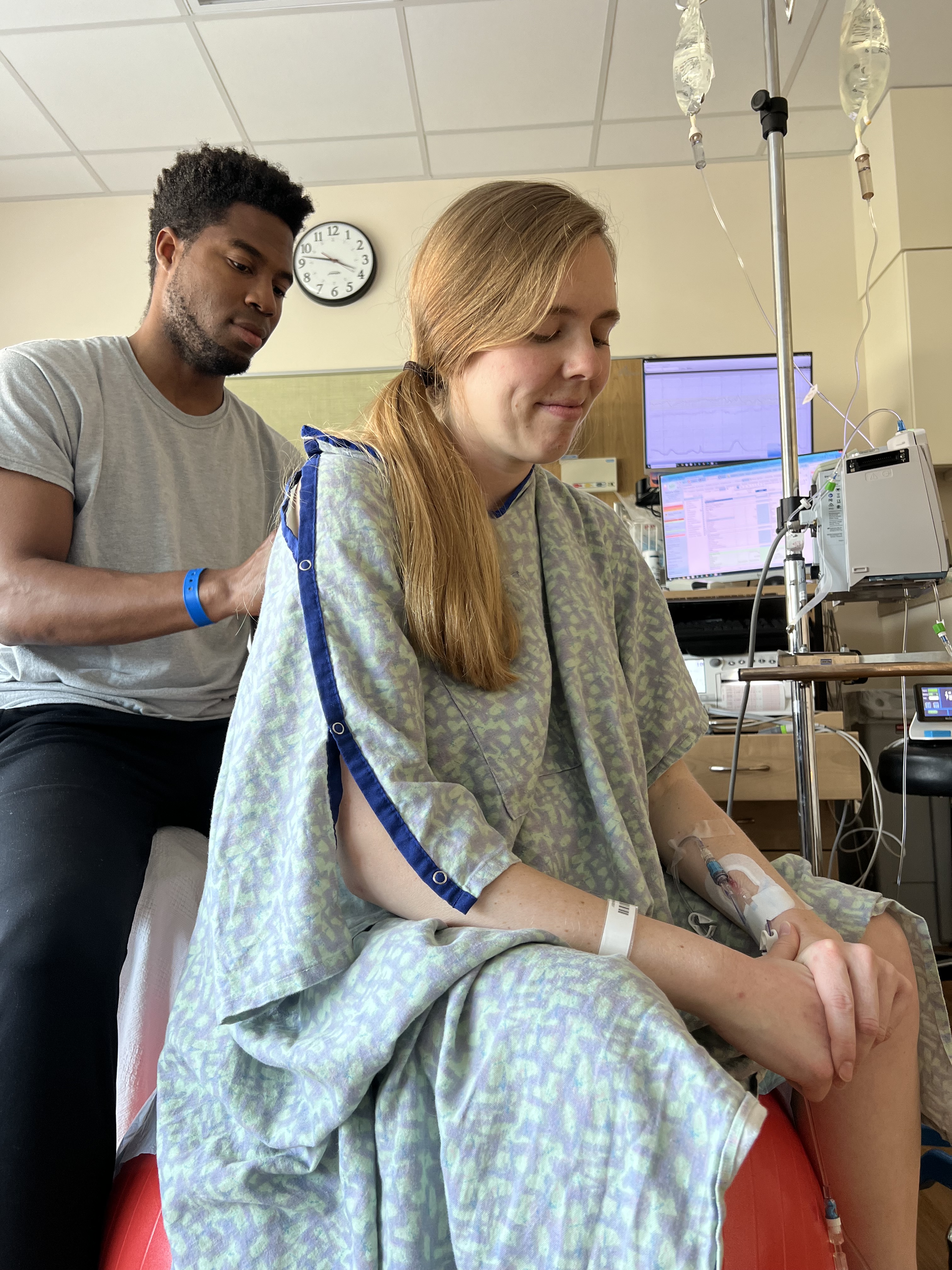The anesthesiologist came in around 5pm and Rebecca gave me a bear hug to keep me still during the contractions. Kristoff stood outside the door waiting for the “all clear” to come back into the room. I felt a sharp bee sting 2x (doubled the test amount) that lasted for 5 seconds at most and then an uncomfortable tingling sensation. The whole procedure took at most 20 minutes. The anesthesiologist wanted to set it to a 12, but Rebecca advocated for me and asked for a 10 (not as strong of a dose). I was able to still wiggle my toes and move slightly which I liked.