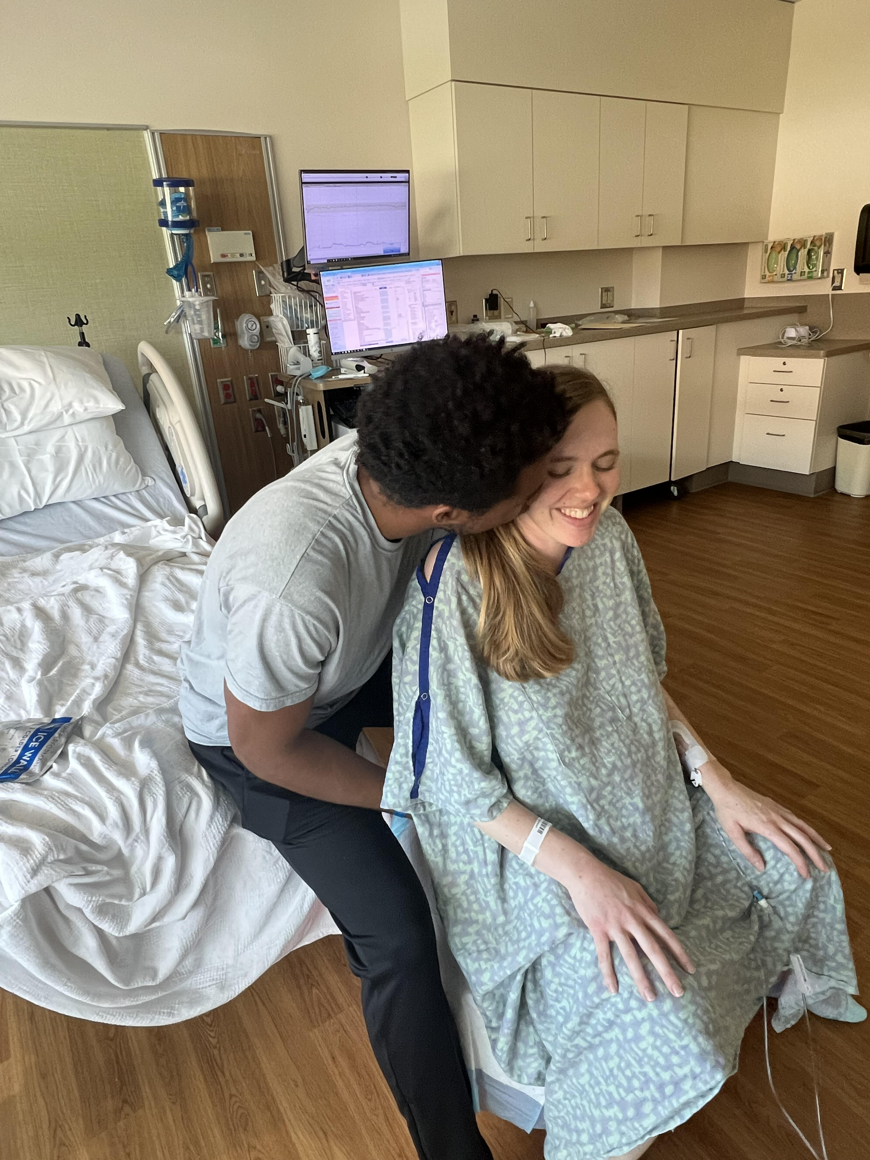 At 2:30pm we bumped the Pitocin from a 2 to a 3. At 4:15pm it was moved to a 6 and at 4:30pm it was moved to an 8. As I worked through every single contraction that was gaining in intensity, Kristoff was my rock and my safe place. The experience was extremely intimate, and humbling. I would never have been able to do it without him and I’m so grateful he was there for every single moment. He supported me in multiple positions and would place ice packs on my back as needed. I walked around the hospital room thanks to a Bluetooth fetal tracing monitor and also bounced on the yoga ball they had there.