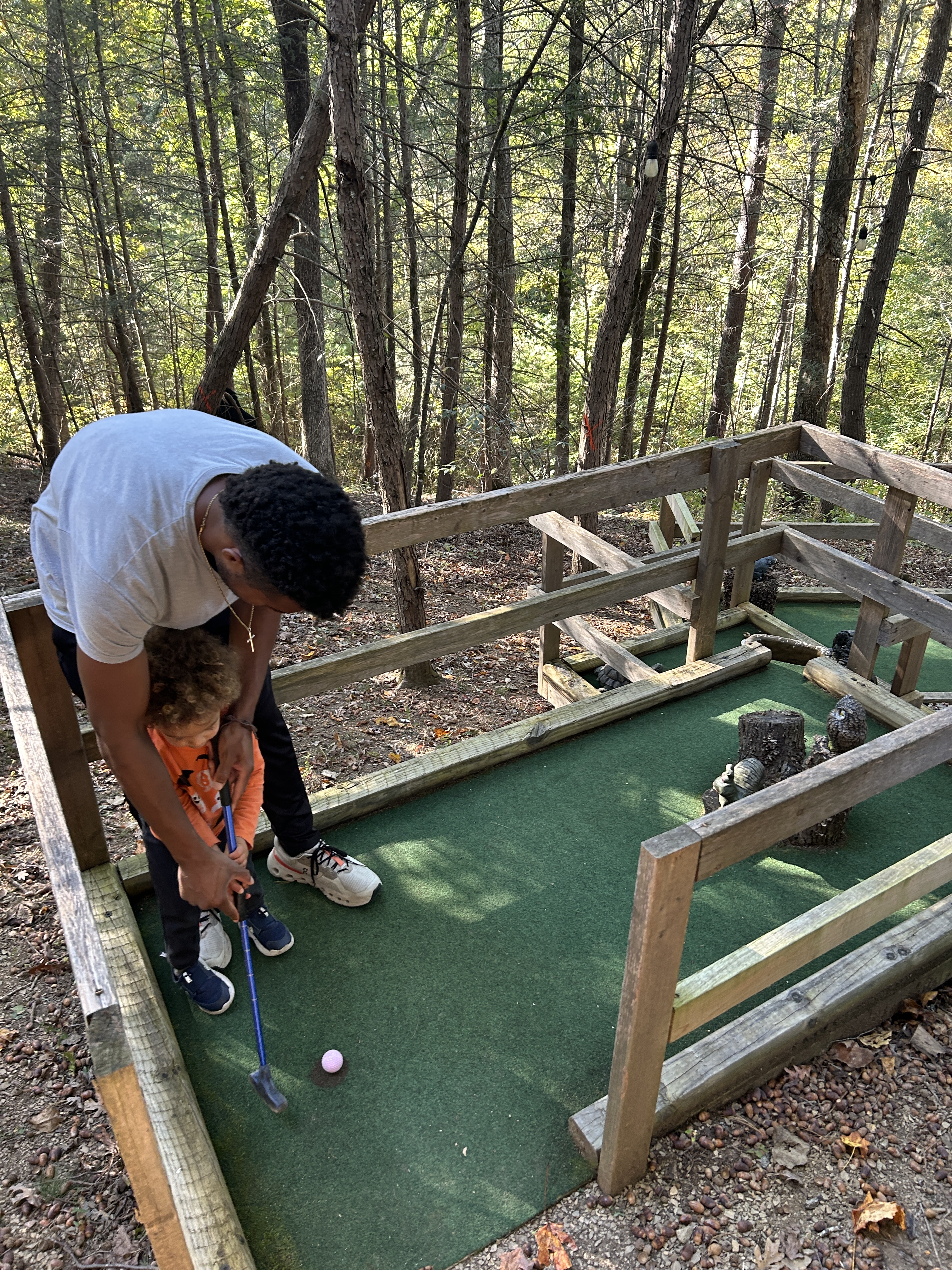When we got back to the car we felt pride, excitement, and joy to have just spent the day in nature together. We drove to our AirBnb in Pigeon Forge (more off the beaten path), which was just what we needed after spending a night in busy, busy Gatlinburg. Firefly Bungalow had a private mini-golf course that we enjoyed with Elias, but also as a fun date activity after we put him to sleep. It also offered a firepit and lots of animals for our 2yr old to feed. We would definitely stay here again in this adorable treehouse! E’s favorite part was feeding the goats, mini horses, and donkey. Click here to view the listing if you are interested in booking! It was very cozy and clean. The decor inside the treehouse was incredible too and made me want to turn our kid’s bathroom/guest bathroom into a “bear themed” oasis.