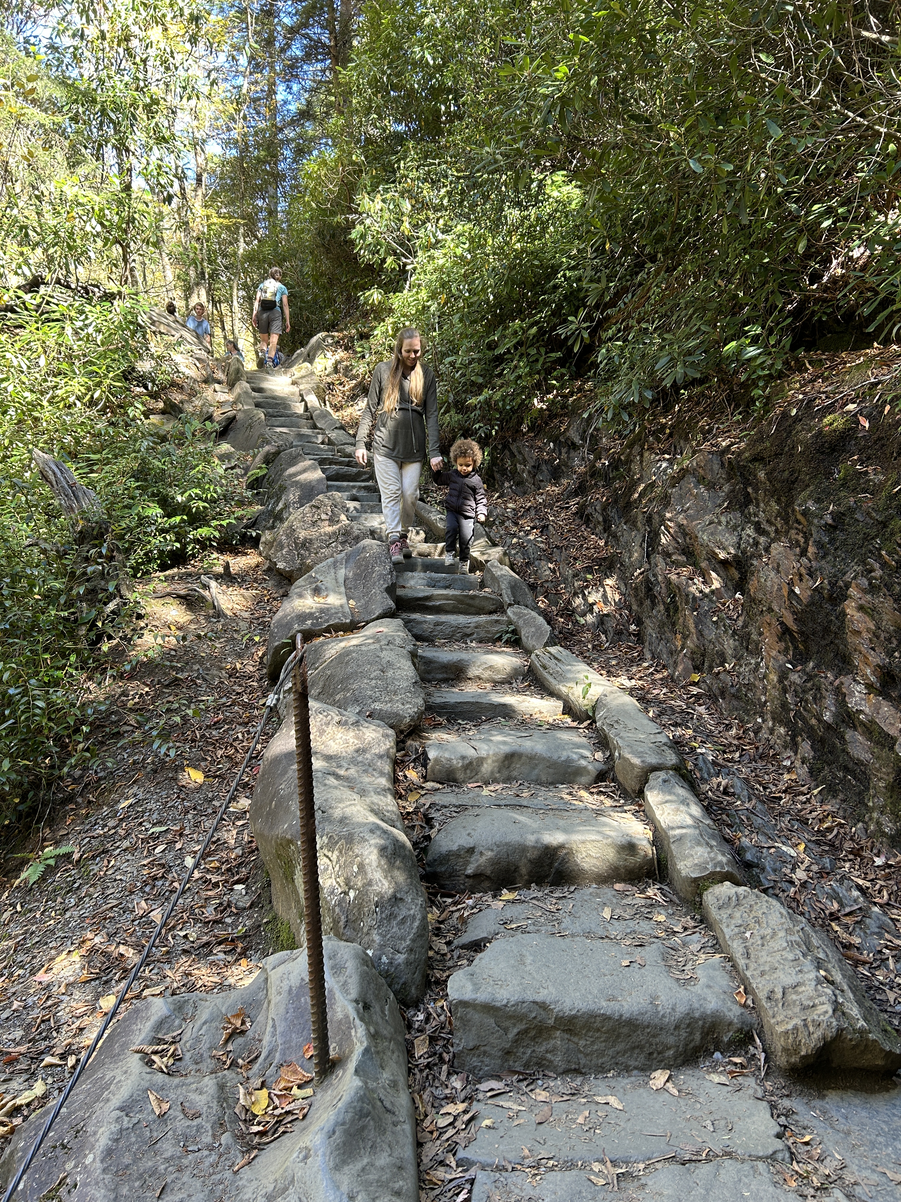 We all slept super good after showers that night and woke up early to our alarm clocks blaring at 7am. We quickly got dressed and ran to the free breakfast offered by our hotel. It was WAY better than the free breakfasts we are used to since it had sausage gravy + biscuits, a yogurt parfait bar, fresh fruit, eggs, sausage, and more to enjoy before a hike! We spent a little long here and probably didn’t check out closer until 8am. By 8:30am we arrived at Sugarlands Visitor Center to print our Great Smoky National Parks parking pass since we didn’t plan ahead and print a pass at home before arriving. Around 9am Kristoff dropped Elias and I off at the trailhead with the bulk of our stuff, while he took the car to find parking. We couldn’t believe how busy it was!! Right around 9:30am when I started to worry, he popped around the corner and was ready to begin the hike. I had put Elias in the carrier on my back, so my shoulders were starting to get tired. I was relieved when Kristoff walked around the corner.